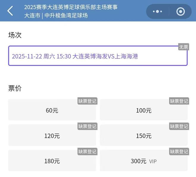 11月18日下午,2025中超收官輪大連英博與上海海港一役的球票,正式開票。結果,此役延續(xù)了大連梭魚灣足球場的火爆態(tài)勢,各檔次的球票早早售罄。